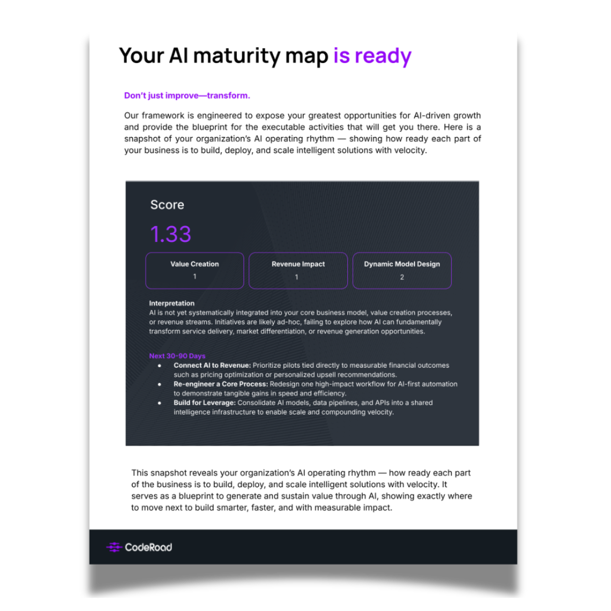Built around six dimensions: Leadership, Business Model, Work Design, Value Delivery, Velocity, and Leverage, this roadmap translates insight into direction. Engineered for intelligent transformation, it reveals where you stand on the AI curve and gives you the blueprint to build faster, smarter, and with purpose.